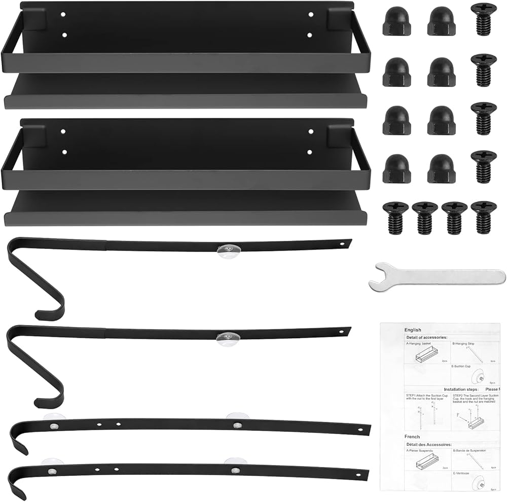 Jigiu Shower Shelf For Hanging Stainless Steel Double Shower Shelf No Drilling Bathroom Shelf For Hanging Shower Screen Including Suction Cup 2 Store Shower Basket With One Piece Hooks Matt Black